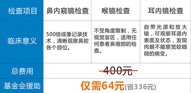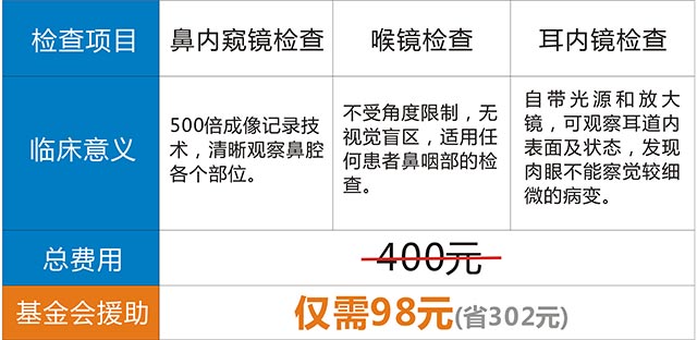 此次活动由中国五官科健康基金会对耳鼻喉疾病的人群进行基金援助,耳鼻喉三项筛查专业检查(鼻内窥镜检查、喉镜检查、 耳内镜检查)一共400元,申请参与活动成功后,只需98元即可享受专业全面的耳鼻喉检查。