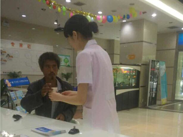 点咨询医生 8月19日下午15时许,西安中大耳鼻喉医院医护人员见一位神情焦虑的老人在医院附近徘徊,走进了解情况后便毫不犹豫的将他搀扶到了中大医院。当得知眼前这位老人正面临遗失孩子、身份证、钱包的不幸时,中大导医热心的将自己的手机借给了老人,让他能够打个电话回家,为他打来热水,洗去满脸污垢,并主动端茶递给老人,在邻近的超市买来面包供他充饥。